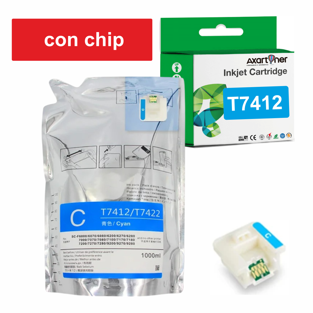 Compatible Epson T7412 Cyan - con chip - Bolsa de Tinta de Sublimacion C13T741200 para SureColor SC-F6000, SC-F6070, SC-F6200, SC-F6270, SC-F7200, SC-F9200