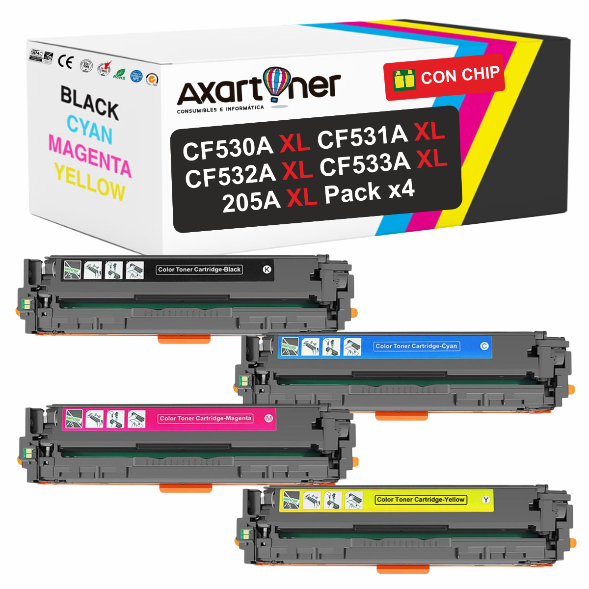 Compatible Pack x 4 HP CF530A XL / CF531A XL / CF532A XL / CF533A XL Cartuchos de Toner 205A