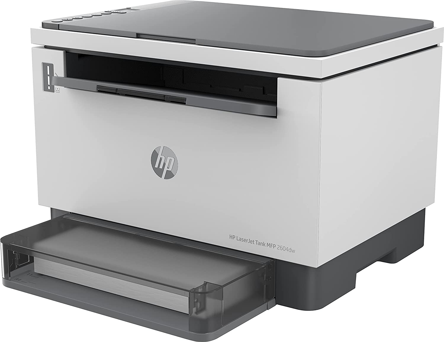 Descubre las capacidades empresariales y el ahorro de la impresora multifunción HP LaserJet Tank 2604dw previamente cargada con hasta 5000 páginas de Tóner Original HP.