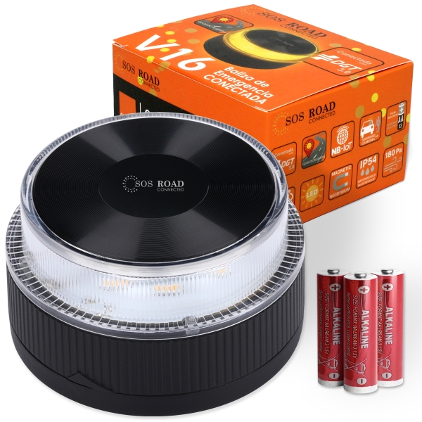 Baliza de señalización de emergencia en carretera, producto certificado V16 conforme con las especificaciones de la Dirección General de Tráfico para dispositivos de pre-señalización de peligro luminosa conectadas.